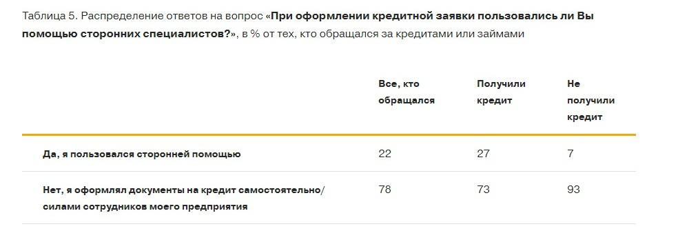 Любопытно, что при оформлении заявки на кредит пользовались советами сторонних специалистов 22%, а самостоятельно оформляли 78%. Предприниматели, не прибегавшие к внешним консультациям, получали одобрение по кредитам реже (7%).