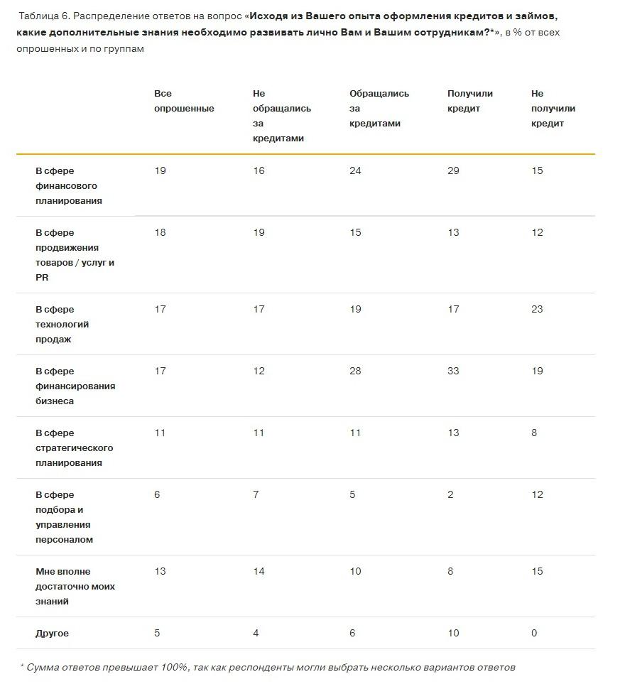Субъекты МСП, имеющие положительный опыт кредитования, в большей степени ориентированы на расширение знаний о финансировании бизнеса (33%) и финансовом планировании (29%), в отличие от предпринимателей, которые получили отказ в кредитовании. Для последних важно получение знаний в части продаж (23%), подбора и управления персоналом (12%).