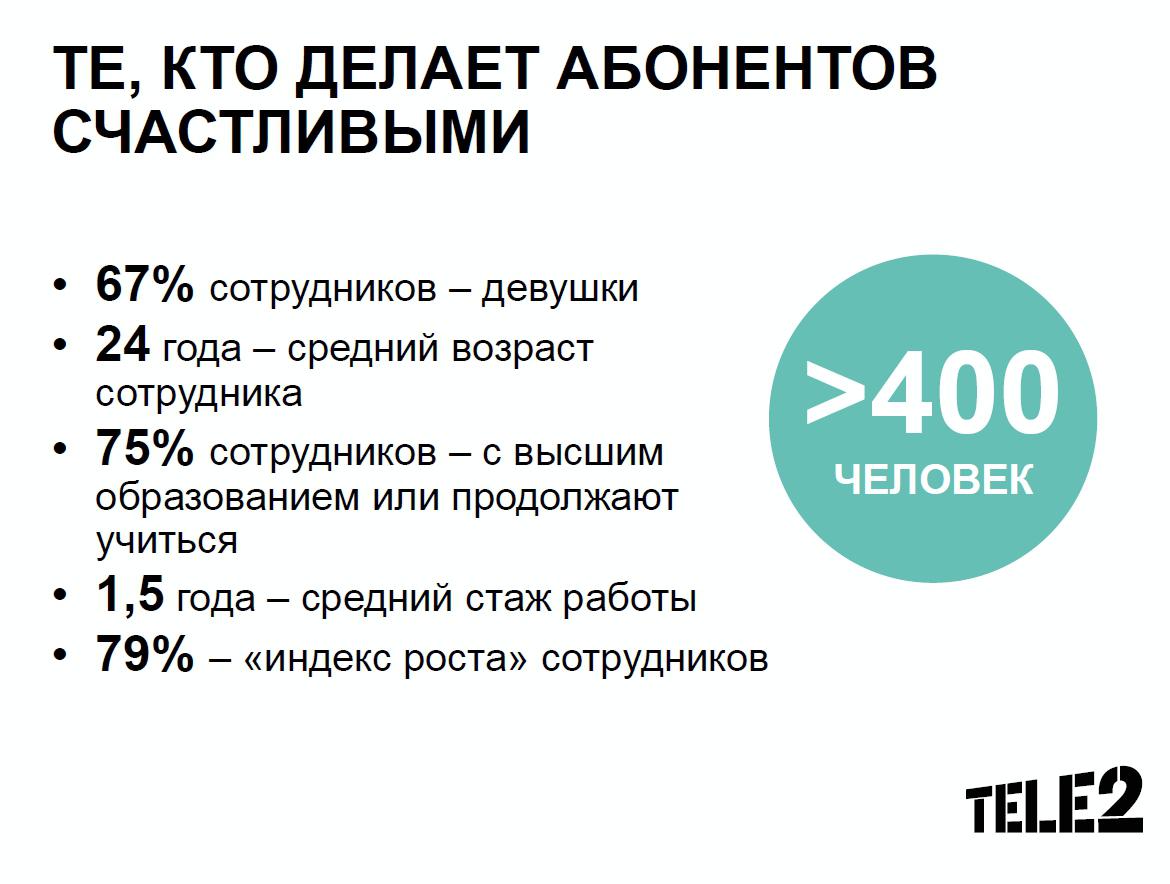 У Tele2 четыре контакт-центра, "места силы", где специалисты компании быстро и профессионально отвечают на любые вопросы абонентов Tele2. Центры, кроме Иркутска, расположены также в Ростове, Саранске и Челябинске. Иркутский обслуживает абонентов Сибири и Дальнего Востока.