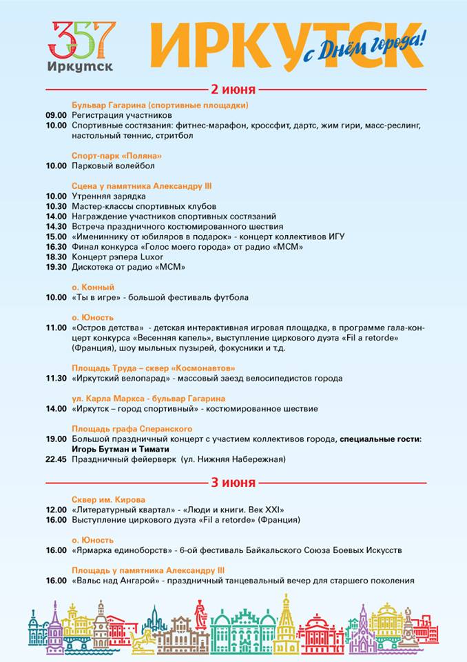 На площади у Александра III в 10.00 начнется утренняя зарядка, и далее пройдут спортивные состязания, сообщаетпресс-служба администрации Иркутска. В 15.00 запланирован концерт коллективов ИГУ «Имениннику от юбиляров в подарок», в 16.30 пройдет финал конкурса «Голос моего города» от радио «МСМ», в 18.30 – концерт рэпера Luxor и в 19.30 –дискотека от радио «МСМ».