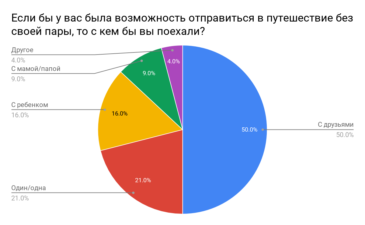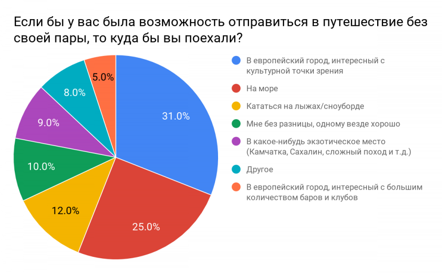 Выяснилось, что 30% пар поддерживают отпуск по отдельности и путешествуют именно так. 16% респондентов отметили, что сами такой формат отдыха поддерживают, но против выступает их вторая половина. 35% высказались против раздельных отпусков, добавив, что путешествуют только вместе. Еще 19% также высказались против, но допустили раздельные поездки при наличии для этого весомых оснований (например, невозможность взять отпуск в одно время). Те, кто поддерживают отпуск по отдельности, чаще всего аргументируют позицию необходимостью отдыхать друг от друга, либо тем, что у пары могут быть разные интересы (в совокупности эти причины обозначили почти 90% респондентов). Также мы спросили пользователей, куда и в какой компании они бы поехали, если бы отправились в поездку без второй половины. В качестве возможного сценария поездки треть пользователей (31%) выбрали путешествие в европейский город, интересный с культурной точки зрения, 25% респондентов отправились бы на море, 12% – кататься на лыжах или сноуборде. При этом в компанию 50% опрошенных взяли бы друзей, 21% поехали бы в одиночестве, а 16% – с ребенком.