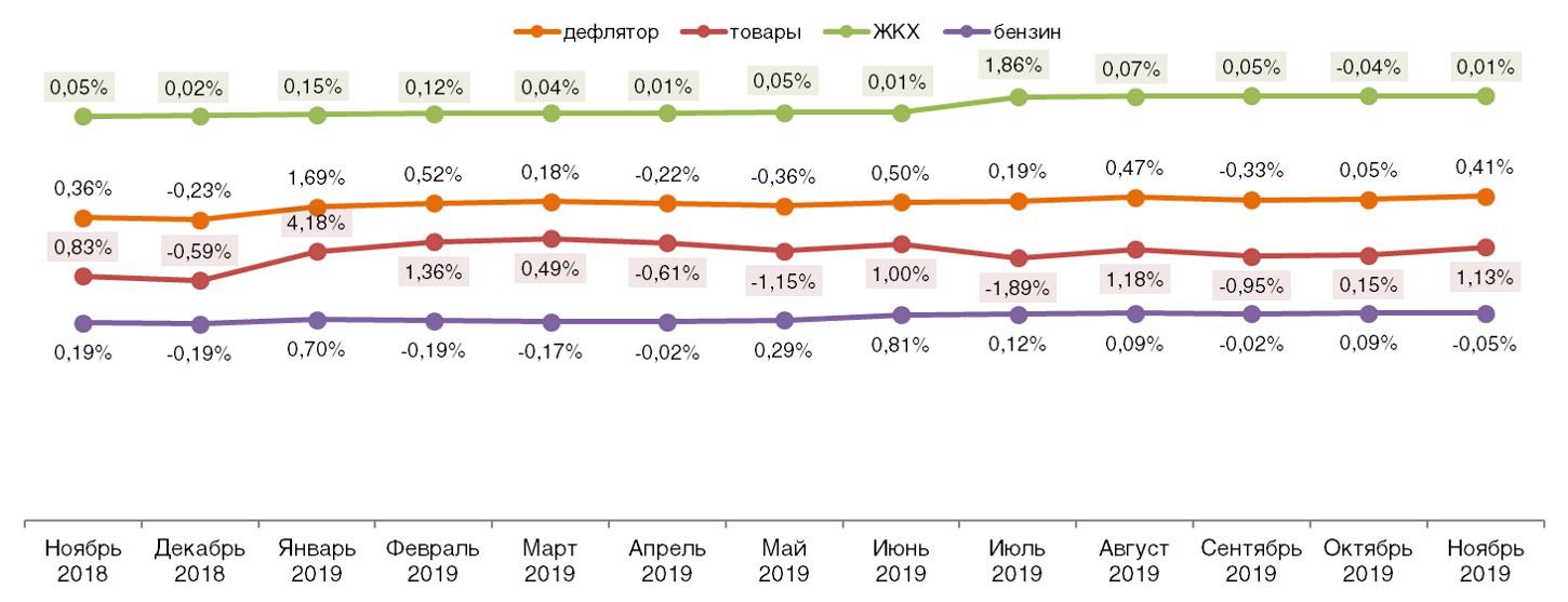 Основным драйвером роста дефлятора в ноябре стал рост цен на товары, который составил 1,1% против прошлого периода. Цены на жилищно-коммунальные услуги и бензин в ноябре продемонстрировали стабильность.