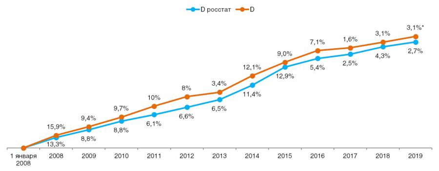 Сравнение дефлятора реальных потребительских цен на товары и услуги со значением индекса инфляции по данным Росстата. По годам. Данные с учетом ноября 2019 г.