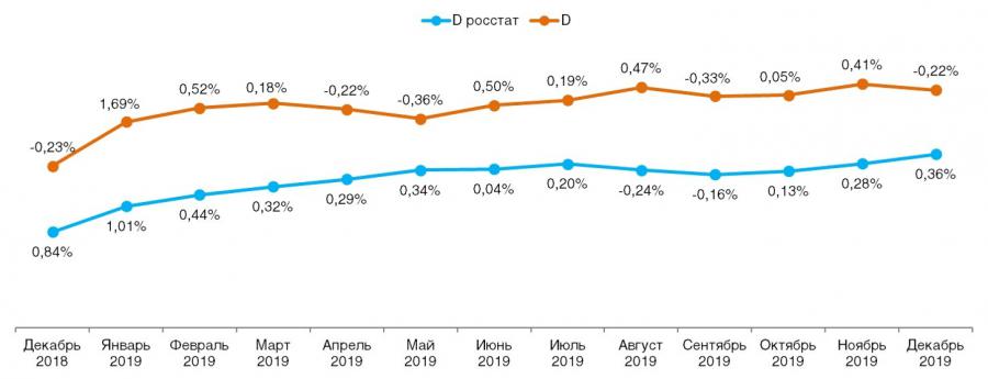 Показатель официальной инфляции в декабре продолжил положительную тенденцию прошлого месяца и по расчётам Росстата получил значение в 0,36%. По данным скан-панели домохозяйств Romir Scan Panel, Дефлятор в декабре повел себя противоположно вектору инфляции и сократился на 0,22% по сравнению с ноябрем. Это несовпадение вызвано отражением в Дефляторе предновогодних скидок и распродаж.