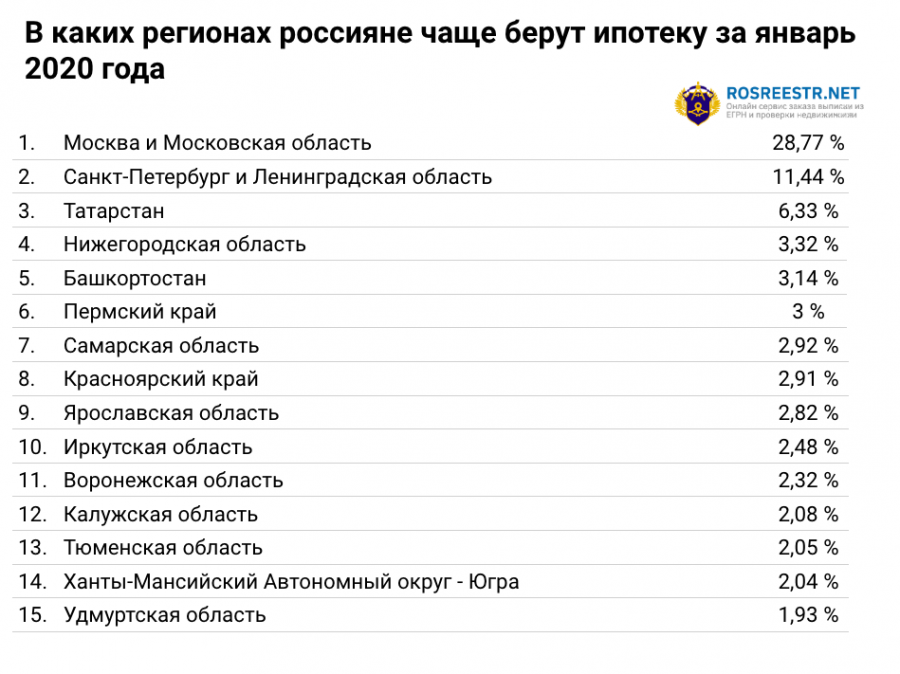 В лидерах по оформлению ипотеки на 2020 год – Москва, Санкт-Петербург и области: 29% и 11%.