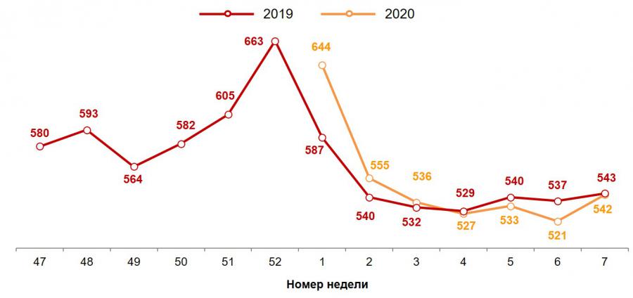 Если сопоставить текущее значение недельного среднего чека со среднегодовым показателем за последние 12 месяцев, то средний чек на 7-й неделе оказался ниже на 7 рублей 70 копеек или 1,4%.