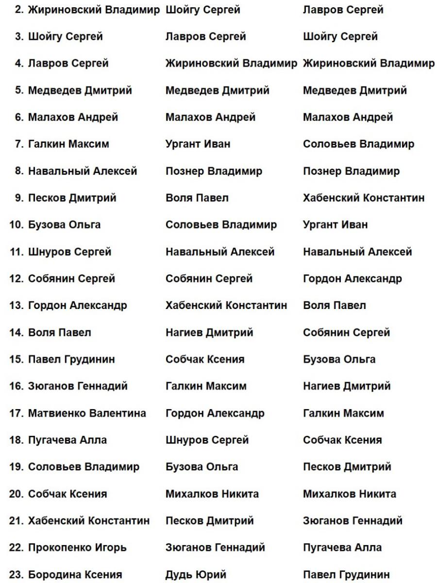 Представители группы со средним доходом выразили большее доверие Сергею Шойгу, Сергею Собянину и Ксении Собчак. Телеведущие Иван Ургант и Владимир Соловьев также заручились их доверием. Россияне со средним доходом чаще заявляли о доверии комику Павлу Воле, актеру и телеведущему Дмитрию Нагиеву и блогеру Юрию Дудю.