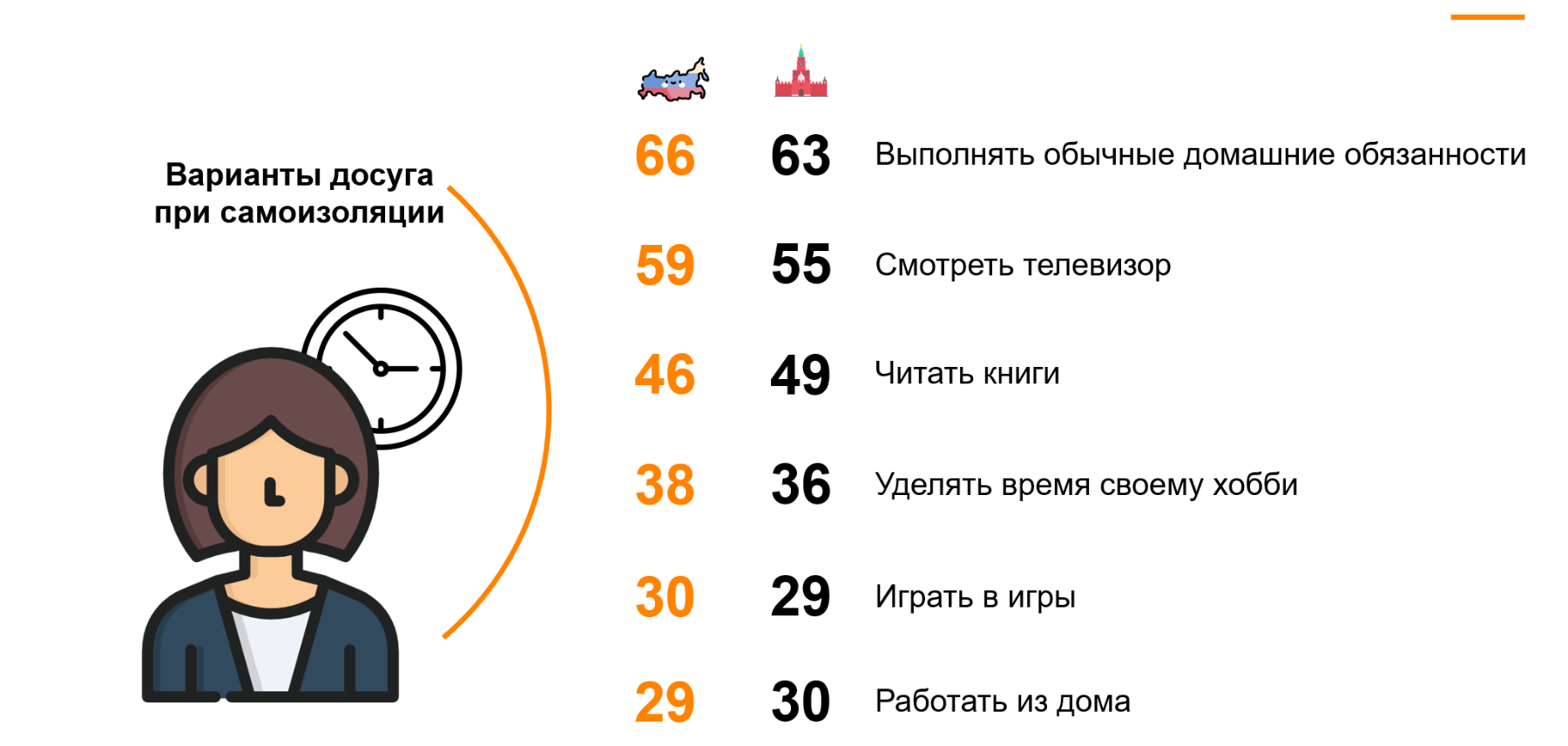 “Россияне смотрят в будущее с осторожным оптимизмом. Большинство считает, что связанные с пандемией будут сняты в горизонте одного-двух месяцев. При этом треть заявляет о готовности сразу же вернуться к привычной жизни. Можно предположить, что эта цифра изменится в будущем, когда люди проведут на домашнем режиме больше времени,” — комментирует директор по работе с клиентами Ромир Ксения Пайзанская.