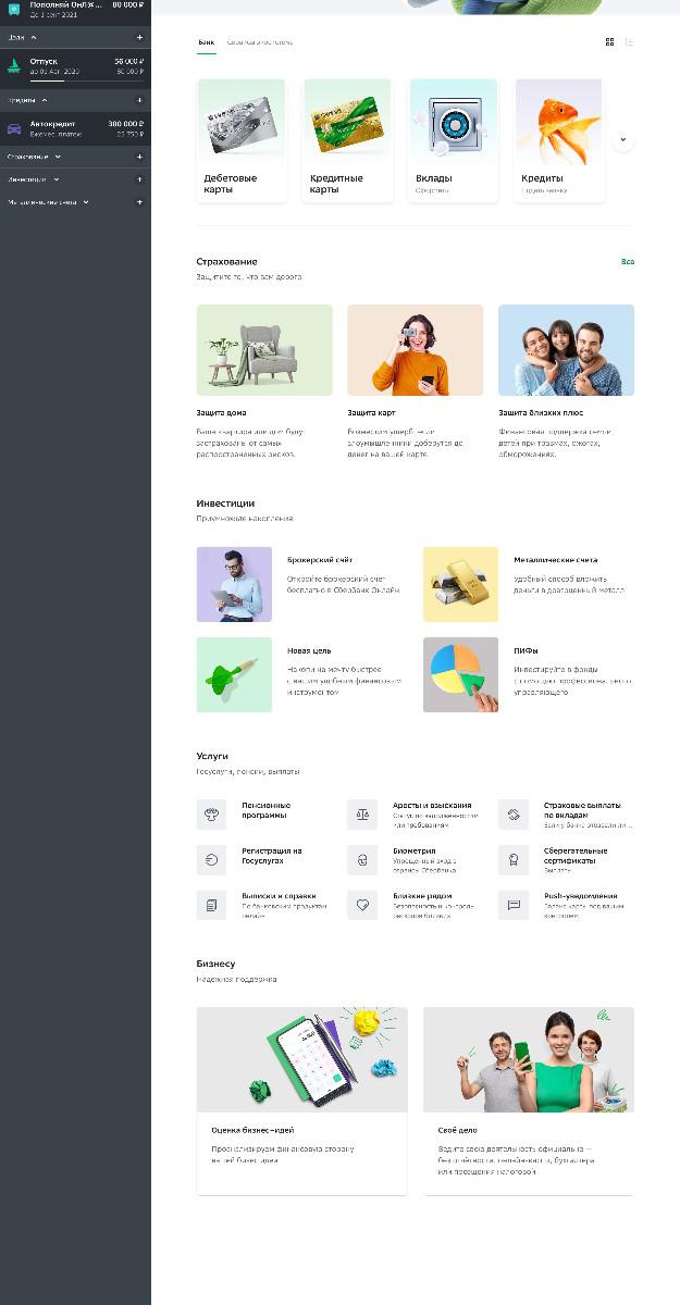 - Важная информация и полезные сервисы стали ближе. Добавилось меню с основными продуктами — это быстрый доступ ко всем картам, счетам и другим продуктам. На главном экране появились карточки платежей, с помощью которых можно быстро совершить нужную операцию.