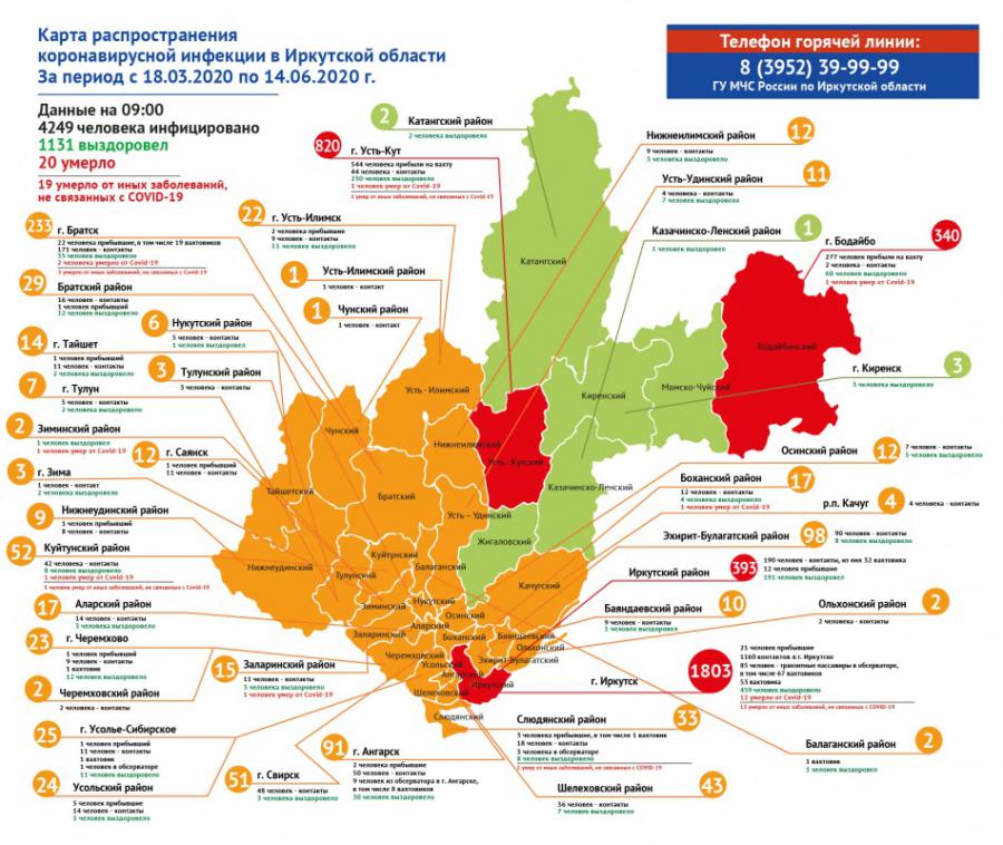 На 14 июня в Иркутской области зафиксированы –127, из них70 – в Иркутске. На втором месте – Усть-Кут, где находится второй очаг по численности заболевших в регионе, на сегодняшний день там насчитывается 820 больных, новых заражений пока не выявлено.