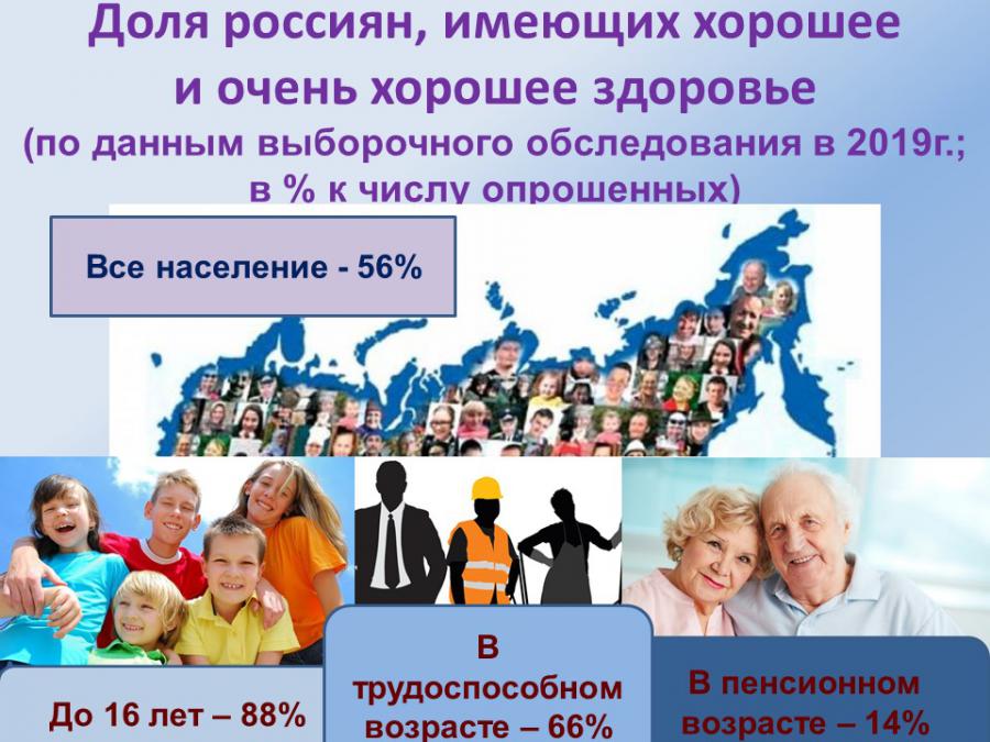 По данным выборочного обследования, проведенного в 2019 году, из российских детей до 16 лет хорошее и очень хорошее здоровье имеют 88%, из лиц трудоспособного возраста – 66%, из числа пенсионеров – лишь каждый шестой.
