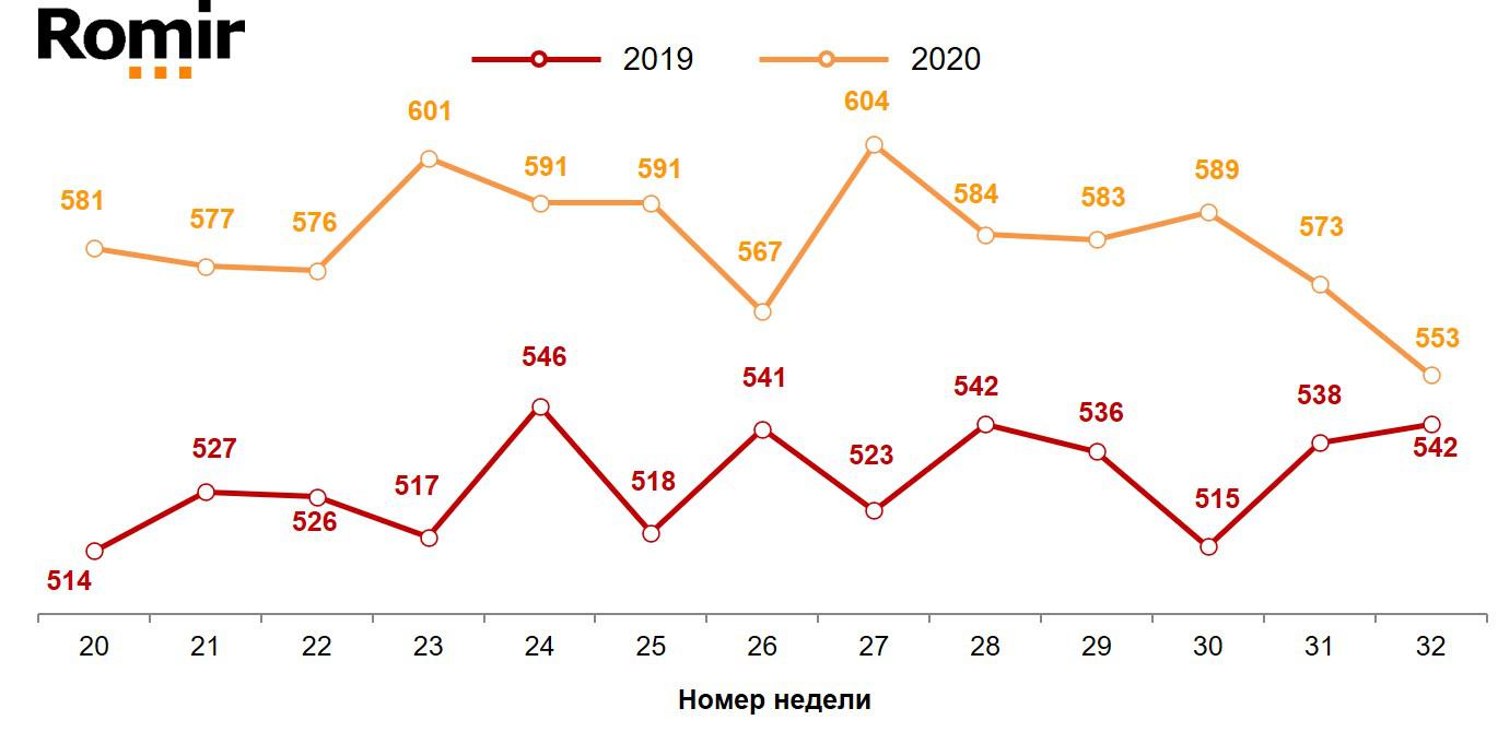 Так, недельный средний чек относительно недели с 27 июля по 2 августа сократился, потеряв 20 рублей (3,5%) и остановившись на отметке в 553 рубля.