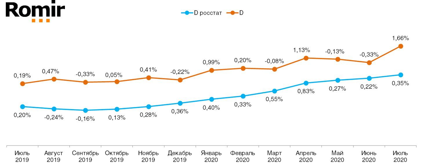 Показатель официальной инфляции в июле продолжил положительную тенденцию девяти прошлых месяцев и по расчётам Росстата получил значение в 0,35%. По данным скан-панели домохозяйств Romir Scan Panel, Дефлятор в июле снова повел себя идентично вектору инфляции и увеличился на 1,66% по сравнению с июнем.