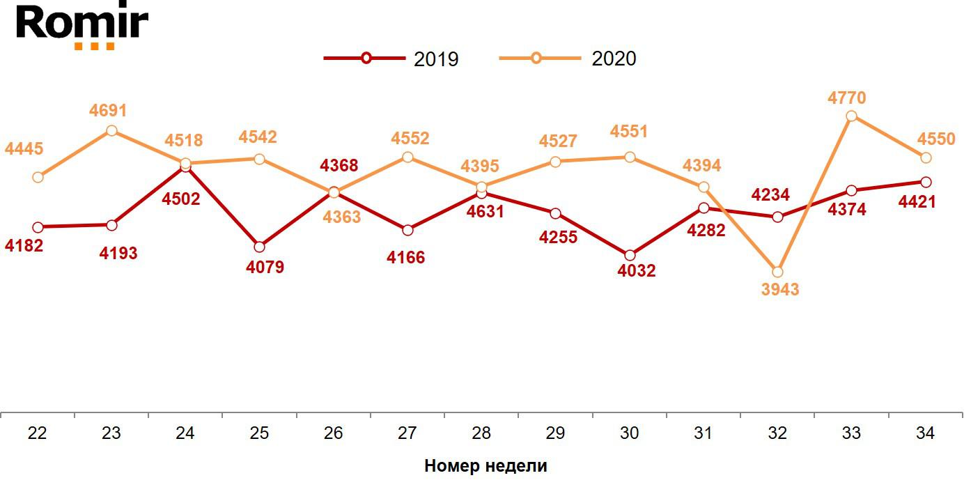 Если сопоставить текущее значение недельных расходов со средним значением за последний год, то расходы недели с 17 по 23 августа оказались выше среднего значения на 42 рубля или 0,9%.