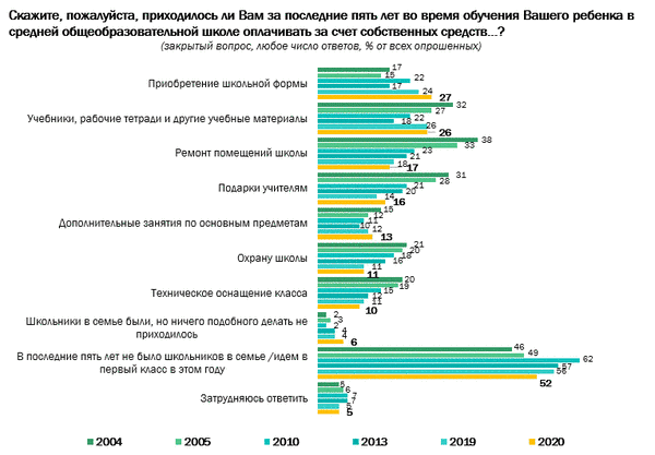Россияне, отправляющие детей или внуков в школу, считают, что обеспечение ребенка школьной формой (50%), оплата дополнительных занятий (25%), покупка учебных материалов (20%) — ответственность родителей. Доля сторонников мнения, что подготовка к школе должна полностью оплачиваться бюджетными средствами, вернулась к значению 10-летней давности (27%).