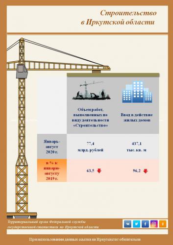 Объем работ, выполненных по виду деятельности “строительство”, в августе 2020 года составил 13,8 млрд рублей, или 51,4% к августу 2019 года, в январе-августе – 77,4 млрд рублей (63,5%), сообщает Иркутскстат.