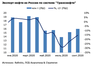 Так, экспорт нефти по системе "Транснефти" в сентябре снизился на 22% г/г и составил 16 млн т. Темпы спада продолжают сокращаться 2 месяц подряд. По сравнению с августом зафиксирован рост экспорта нефти на 5%.