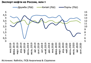 План Транснефти на октябрь предполагает рост экспорта по сравнению с сентябрем на 9% - за счет наращивания поставок в Белоруссию на 13% (до 1,650 млн т), через морские порты – на 7,8% (до 8,3 млн т), через «Дружбу» - на 11% (до 4 млн т). А поставки в Китай сократятся, судя по плану, до 2,650 млн т (на 16%). Это будет обусловлено вялым спросом Китая – на фоне более высоких цен на нефть и заполненных хранилищ.