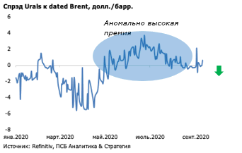 По сути, сейчас за счет спада спроса на нефть в Азии, преимущественно в Китае, который абсорбировал все излишки весной во время карантинов и по минимальным ценам, закрылись арбитражные возможности для европейских сортов нефти, в том числе – для российского сорта Urals. Это обуславливает, на наш взгляд, наблюдаемую тенденцию к сужению премии Urals по отношению к североморской смеси Brent. Мы считаем, что разворот в сторону «нормального» дисконта (Urals обычно дешевле Brent на 1,5 долл./барр., а наблюдаемая с весны этого года премия в 2-2,5 долл./барр. – аномальная ситуация) можно ожидать со следующего года.