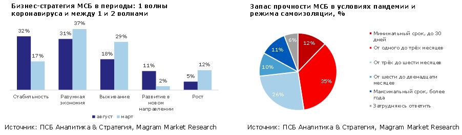 Также в докладе поднимался вопрос о запасе прочности МСБ в сравнении с более крупным бизнесом – по данным ВБ, в среднем МСБ обладают ликвидностью для покрытия постоянных затрат в течение 2,5 месяцев, что на три недели меньше, чем у крупного бизнеса. Результаты RSBI в целом подтверждают выводы ВБ: по данным апрельского опроса, среди компаний, пострадавших от пандемии, 12% имели запас прочности менее, чем на месяц, а 35% - на срок от одного месяца до трех.