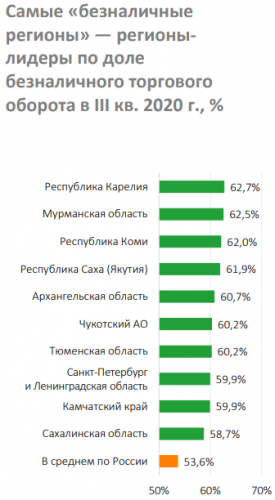 На первом месте находится Республика Карелия (62,7% покупок по карте), далее с небольшим отставанием следуют Мурманская область и Республика Коми (62,5% и 62,0% соответственно). В целом все регионы из топ-10 уже вплотную подобрались к пороговому значению и, по нашим ожиданиям, превысят его уже в начале 2021 года.