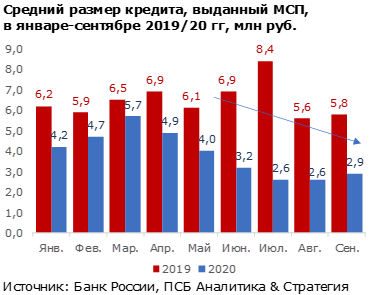 Таким образом, рост числа выданных кредитов и одновременное сокращение их объема в денежном выражении свидетельствуют о снижении среднего размера кредита. За 9 м.2020 г. средний кредит сократился на 40% г/г и составил 3,9 млн руб. При этом только за 3 кв. 2020 г. снижение составило 59% г/г. Уменьшение размера среднего кредита – чаще всего кризисное явление, которое может сигнализировать, что денежные средства всё больше необходимы МСП на покрытие дефицита оборотных средств, а не на глобальные инвестиции в бизнес. При этом выдача такого большого числа кредитов обусловлена преимущественно субсидированием со стороны государства. Следовательно, при отсутствии мер господдержки, направленных на кредитование предпринимателей, в 4 кв. 2020 г. число МСП, получивших кредит, может сильно сократиться.