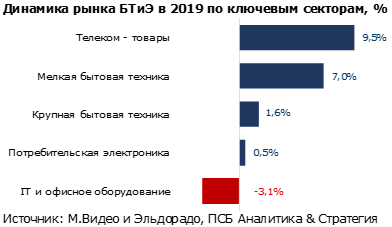 Телеком–товары, а в частности смартфоны/телефоны, носимые «умные» гаджеты и аксессуары - наиболее емкий и максимально развивающийся сегмент рынка БТиЭ (бытовой техники и электроники). Увеличение продаж смартфонов в 2019 г. было одним из основных драйверов роста рынка БТиЭ в целом и продолжает им оставаться в 2020 г. За 2019 г. телеком-товары в среднем росли в несколько раз быстрее остальных сегментов рынка.
