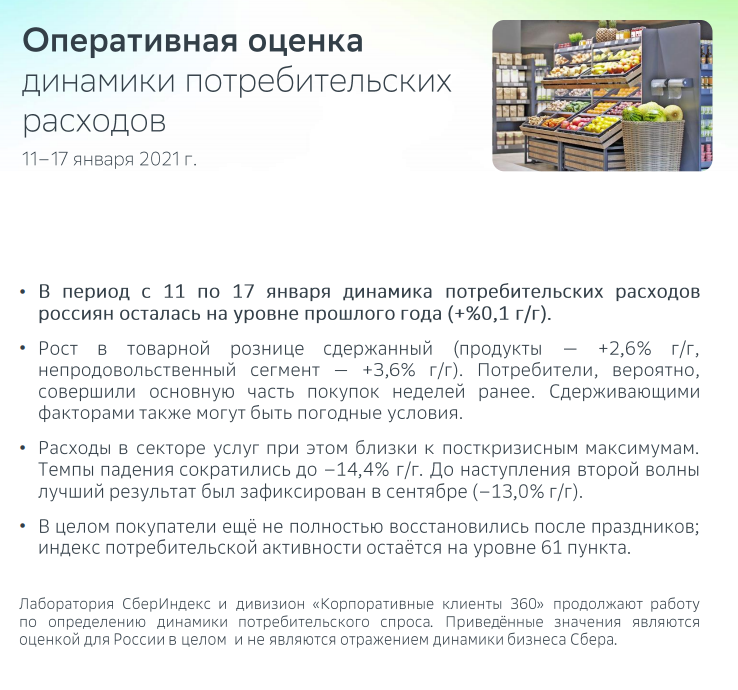 Расходы в секторе услуг при этом близки к посткризисным максимумам. Темпы падения сократились до –14,4% г/г. До наступления второй волны лучший результат был зафиксирован в сентябре (–13,0% г/г). По мнению аналитиков СберИндекса, в целом покупатели ещё не полностью восстановились после праздников; индекс потребительской активности остаётся на уровне 61 пункта.