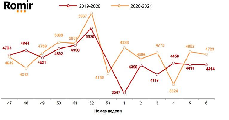 Согласно данным исследовательского холдинга Ромир, с 8 по 14 февраля 2021 года недельные расходы сократились до уровня 4 723 рублей.