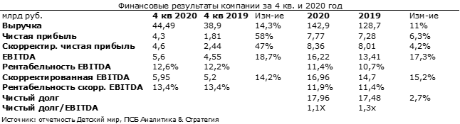 Детский мир, крупнейший в России и Казахстане ритейлер на рынке детских товаров, сегодня опубликовал финансовые результаты за 4 кв. и 2020 г. На конец декабря группа объединяла 868 магазинов и в текущем году планирует открыть минимум 70 магазинов основного формата. Результаты Детского мира за 4 кв. оказались лучше прогнозов в части чистой прибыли, но ниже в части EBITDA.