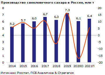 После спада в производстве сахара в 2020 году посевные площади сахарной свеклы и ее валовый сбор, согласно нашим ожиданиям, будут увеличиваться. Посевные площади сахарной свеклы могут составить в 2021 году 1 140 тыс. га (+23,0%), сбор сахарной свеклы может составить 43,1 млн т (+33,0%). Увеличение посевных площадей и рост сбора урожая будет способствовать восстановлению производства в 2021 году: по нашим оценкам, выпуск сахара вырастет до 6,4 млн т.