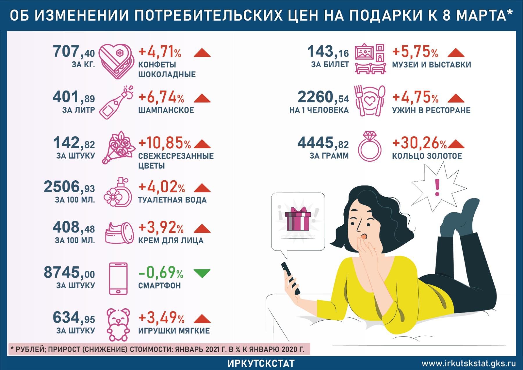Иркутскстат опубликовал данные, согласно которым цены на популярные подарки к Международному женскому дню за год в Иркутской области выросли на 3–30%.