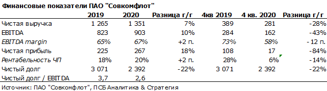 Выручка Совкомфлота на основе тайм-чартерного эквивалента по итогам 2020 года по МСФО выросла на 6,7% г/г, до 1350,6 млн долл., при этом, около 50% выручки поступило от транспортировки сырой нефти и нефтепродуктов. В 4 кв. ставки фрахта сезонно снижались, что оказывало давление на выручку (-28% г/г).