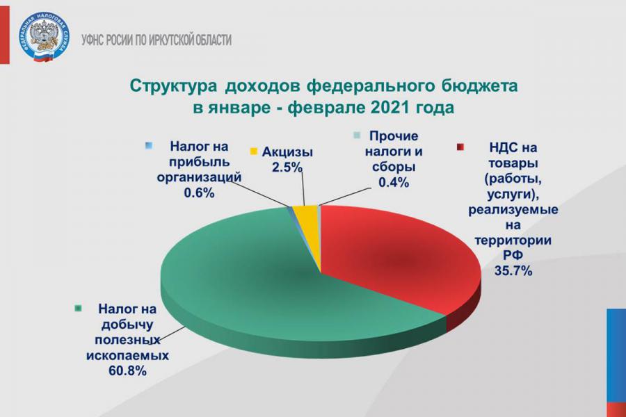 Объем платежей в федеральный бюджет за два месяца нынешнего года почти на 2 млрд рублей или на 4% ниже уровня аналогичного периода 2020 года. В структуре доходов федерального бюджета 61% приходится на налог на добычу полезных ископаемых – свыше 26 млрд рублей. При этом поступления НДПИ в федеральный бюджет на 3 млрд рублей или на 11% ниже уровня января - февраля 2020 года.
