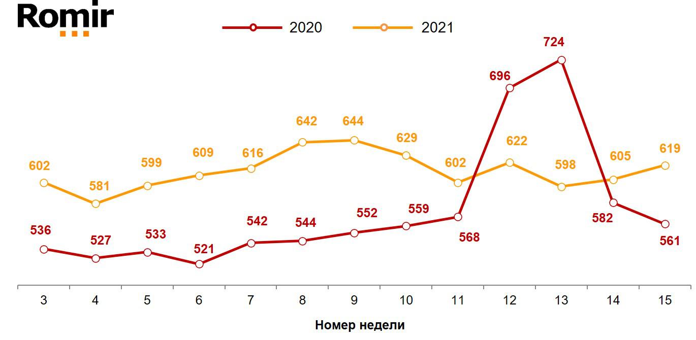 Согласно данным исследовательского холдинга Ромир, с 12 по 18 апреля 2021 года недельный чек россиянина составил 619 рублей: на 2,3% (14 рублей) выше, чем на прошлой неделе и на 10,3% (58 рублей) выше, чем за этот же период в 2020 году.
