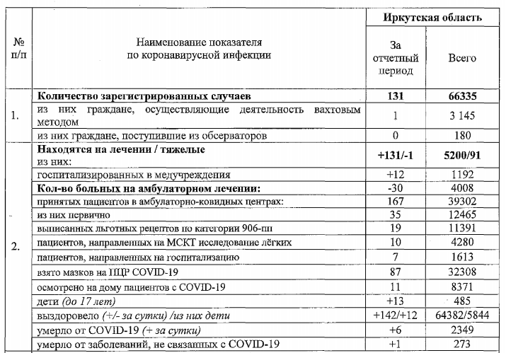 Региональный оперштаб опубликовал данные о распространении коронавируса в Иркутской области. Согласно информации организации, суточный прирост больных в Приангарье сократился до 131 случая.