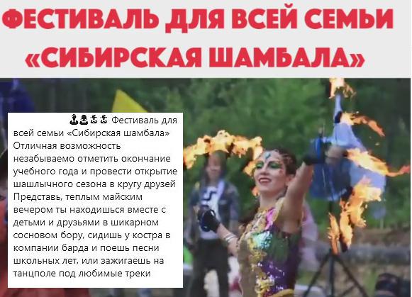 Организаторы фестиваля для всей семьи «Сибирская шамбала» пишут: «Представь, теплым майским вечером ты находишься вместе с детьми и друзьями в шикарном сосновом бору, сидишь у костра в компании барда и поешь песни школьных лет…».