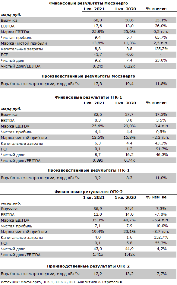 Увеличение выручки компаний ГЭХ обусловлено сильной конъюнктурой на рынке электроэнергии, где наблюдался рост потребления и цен на фоне восстановления деловой активности в экономике, а также холодной погоды в начале 2021 года. Рост выработки электроэнергии наблюдался у Мосэнерго (+11,8% г/г) и ТГК-1 (+11,0%), в то время как у ОГК-2 по этому показателю наблюдалось снижение (-7,7% г/г)