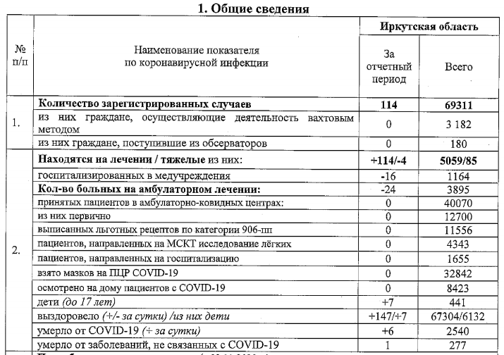 Региональный оперштаб опубликовал данные о заболеваемости коронавирусом в Иркутской области. Согласно информации, всего с начала пандемии болезнь в Приангарье обнаружили у 69 311 человек.