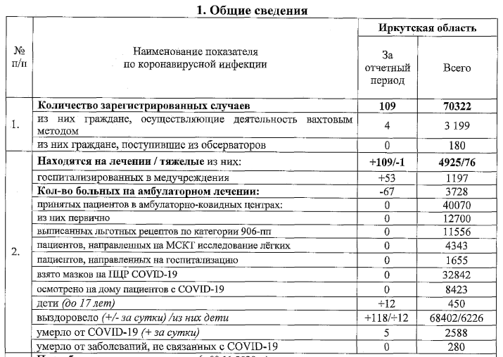 Региональный оперштаб опубликовал данные о заболеваемости коронавирусом в Иркутской области. Согласно информации, всего с начала пандемии болезнь в Приангарье обнаружили у 70 322 человека.