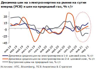 Восстановление темпов экономического роста и более холодная погода способствовали росту потребления электроэнергии, которое за первые 5 месяцев выросло на 4,8% г/г в Единой энергосистеме России. Считаем, что ожидания жаркой погоды синоптиками создают предпосылки и для сохранения высокой положительной динамики потребления электроэнергии в середине текущего года. Согласно нашим ожиданиям, потребление электроэнергии в 2021 году вырастет на 3,8% г/г. Увеличение спроса на электроэнергию, а также инфляционные процессы в экономике будут способствовать и сохранению положительной динамики цен на нее во втором полугодии.
