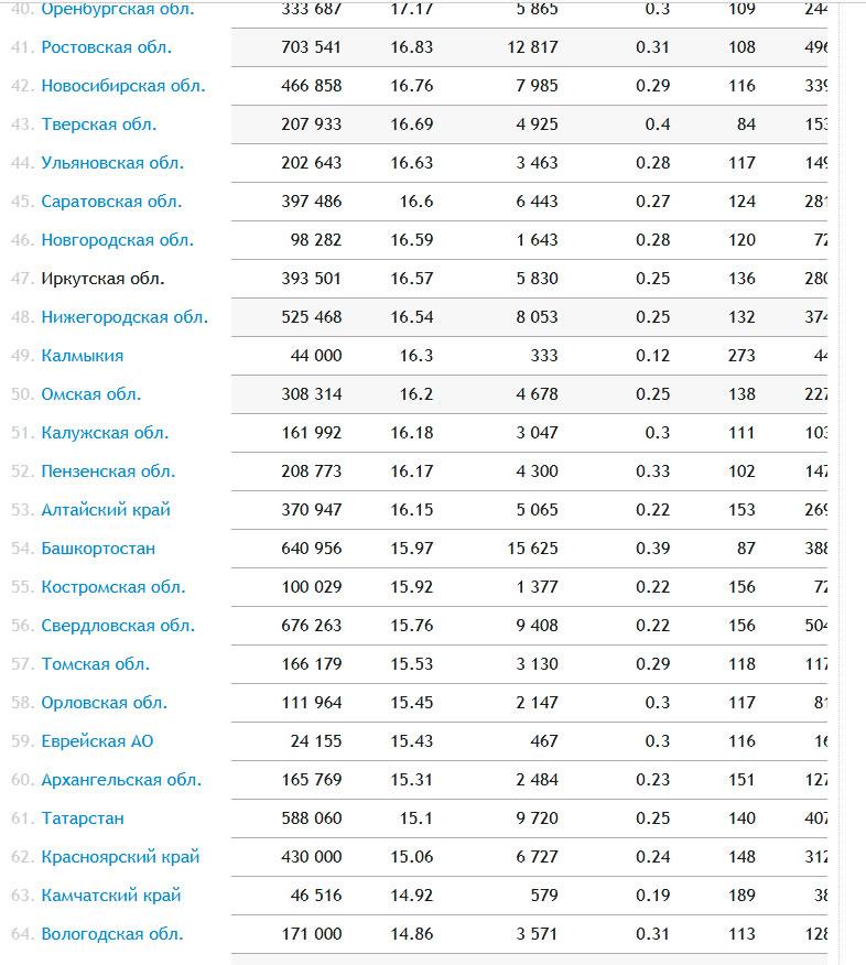 Согласно данным портала GOGOV, соседняя Бурятия на 16 месте (20,5%), Красноярский край на 62 месте (15,0%). На последнем месте Дагестан (5,1%). На первом Чукотский край (34,3%).