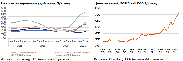 Во 2 квартале наблюдался сильный рост цен на калийные удобрения, что является прямым следствием роста спроса со стороны бразильских фермеров – наиболее крупного в мире рынка. Так, цены на MOP с поставкой FOB Brazil Randonopolis выросли на 84% кв/кв, при этом наибольшее увеличение пришлось на конец июня – сезон высокого спроса. В июле рост продолжился, и цены перевалили за 800 долл./т. Однако бразильские цены на калий являются высоковолатильными, и после окончания сезона можно ожидать их охлаждения. В то же время цены на MOP с поставкой FOB Черное море выросли во 2 квартале слабее – на 11% кв/кв, еще не отреагировав на мировой рост цен.