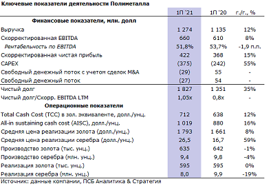 Выручка Полиметалла по итогам 1п. 2021 г. составила рекордные 1,274 млрд долл. (+12% г/г) благодаря росту средних отпускных цен на золото и серебро, которые выросли на 8% и 59% г/г соответственно.