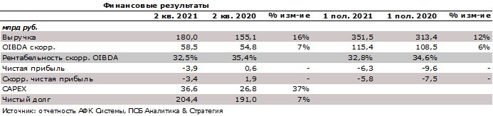 АФК Система увеличила выручку во 2 кв. 2021 г. на 16,0% г/г до 180,0 млрд руб. за счет роста ключевых активов. Наибольший вклад внесла компания МТС за счет превалирующей доли в портфеле. Он увеличил выручку на 10,6% г/г (эквивалент 12,3 млрд руб. в выручке Системы) благодаря росту потребления основных телекоммуникационных и финансовых услуг, увеличению выручки розничного сегмента, а также благодаря существенному вкладу цифровых и облачных решений для бизнеса. Второй по вкладу оказалась Segezha Group (+44,9% г/г, вклад в выручку Системы 7,6 млрд руб.) – рост связан с восстановлением спроса со стороны строительной отрасли и увеличением цен на все виды продукции группы. Медси (+60,3% г/г, вклад в выручку Системы 2,8 млрд руб.) нарастила выручку за счет восстановления спроса на плановую медицинскую помощь, при сохраняющемся спросе на услуги, связанные с COVID-19. Наибольший темп роста среди ключевых активов отразил агрохолдинг СТЕПЬ благодаря увеличению выручки во всех ключевых сегментах (+76,6% г/г), однако из-за сравнительно небольшого размера вклад в выручку Системы составил только 2,1 млрд руб.