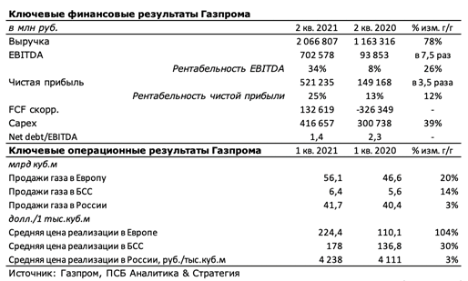 Выручка во 2 кв. 2021 г. выросла на 78% г/г, до 2,06 трлн руб. на фоне наращивания объемов продаж газа на всех ключевых рынках Газпрома, а также при поддержке высоких цен на газ: к примеру, средняя цена реализации газа в Европе выросла на 104% г/г – до 224 долл./1 тыс.куб.м.