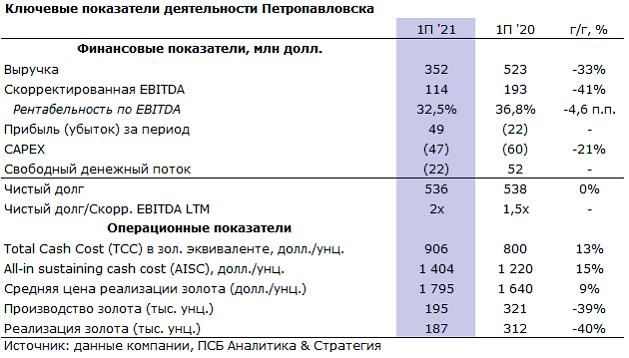 Выручка Петропавловска по итогам 1 полугодия 2021 года составила 352 млн долл., снизившись на 33% в годовом сопоставлении ввиду снижения объемов реализации продукции, которое было частично компенсировано ростом средней цены реализации. По итогам отчётного периода данный показатель увеличился на 9% г/г, до 1 795 долл./унц.