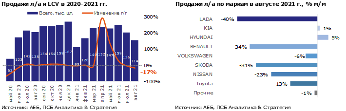 Продажи новых автомобилей и LCV в России августе снизились на 17% г/г (16% м/м) на фоне дефицита чипов, высоких цены на автомобили и сворачивания программы льготного автокредитования. Тем не менее, отдельным автопроизводителям удается показывать рост объемов реализации.