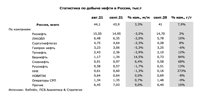 В сентябре Россия нарастила добычу нефти на 3,3% по сравнению с августом 2021 г. По сравнению с сентябрем 2020 г. добыча выросла на 7,9% г/г. Сделка ОПЕК+, по нашим расчетам, исполнена Россией на 97,2%.
