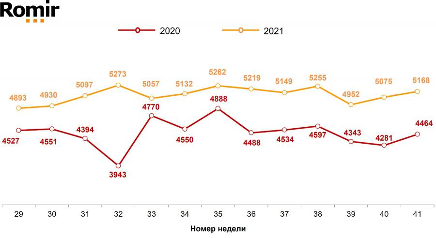 Согласно данным исследовательского холдинга Ромир, с 11 по 17 октября 2021 года средние недельные расходы россиян составили 5 168 рублей, что на 15,8% (704 рубля) больше, чем в аналогичный период 2020 года. По сравнению с предыдущей неделей расходы выросли на 1,8% (93 рубля).